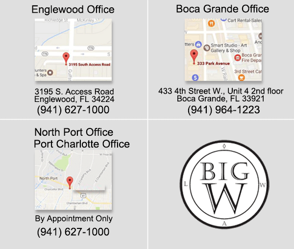 THE BIG W LAW FIRM offers North Port Law Firm, North Port Real Estate and North Port Title Company services; Wellen Park Law Firm, Wellen Park Real Estate and Wellen Park Title Company services; Manasota Key Law Firm, Manasota Key Real Estate and Manasota Key Title Company services; Venice Law Firm, Venice Real Estate, and Venice Title Company Services, Palm Island Law Firm, Palm Island Real Estate, and Palm Island Title Company Services; Port Charlotte Law Firm, Port Charlotte Real Estate and Port Charlotte Title Company Services; Englewood Law Firm, Englewood Real Estate and Englewood Title Company Services; and Boca Grande Law Firm, Boca Grande Real Estate and Boca Grande Title Company services. THE BIG W LAW FIRM has been responsible for handling the closings of tens of thousands of properties in Englewood, North Port, Port Charlotte, Vencie, Manasota Key, Wellen Park, Palm Island and Boca Grande, and can serve all of your Englewood Title Company, North Port Title Company, Port Charlotte Title Company, Manasota Key Title Company, Venice Title Company, Wellen Park Title Company, Palm Island Title Company and Boca Grande Title Company needs, and your Englewood Real Estate, North Port Real Estate, Port Charlotte Real Estate, Wellen Park Real Estate, Manasota Key Real Estate, Palm Island Real Estate, Venice Real Estate and Boca Grande Real Estate needs with the added benefit of being able to also provide legal services for any issues that may arise during the course of the closing unlike a typical title company. THE BIG W LAW FIRM looks forward to serving you in your need for a North Port Law Firm and North Port Title Company, Port Charlotte Law Firm and Port Charlotte Title Company, Englewood Law Firm and Englewood Title Company, Wellen Park Law Firm and Wellen Park Title Comapny, Manasota Key Law Firm and Manasota Key Title Company, Palm Island Law Firm and Palm Island Title Company, Vencie Law Firm and Venice Title Company, and Boca Grande Law Firm and Boca Grande Title Company.